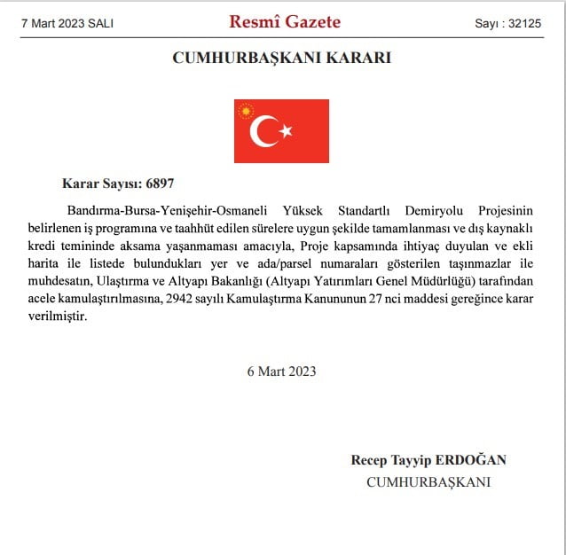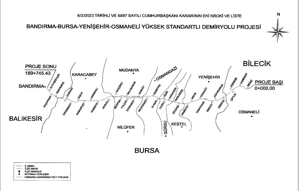 - 0.0.3 BANDIRMA-BURSA-YENİŞEHİR-OSMANELİ YÜKSEK STANDARTLI DEMİRYOLU PROJESİ KAPSAMINDA BURSA İLİ SINIRLARI İÇİNDE ACELE KAMULAŞTIRALACAK İLÇE VE MAHALLELER