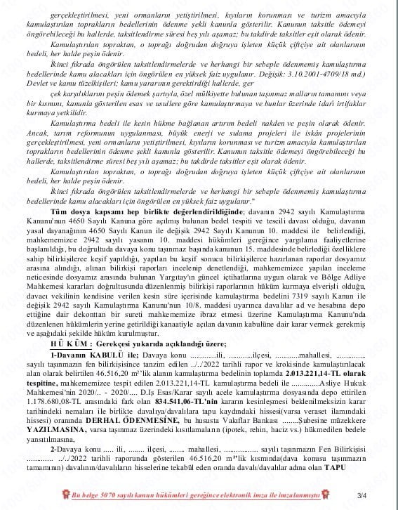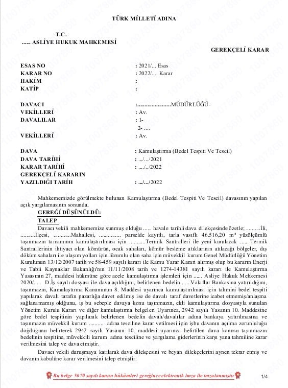 Kamulaştırma Bedelinin Tespiti ve Tesciline ilişkin Emsal Yerel Mahkeme Kararı: