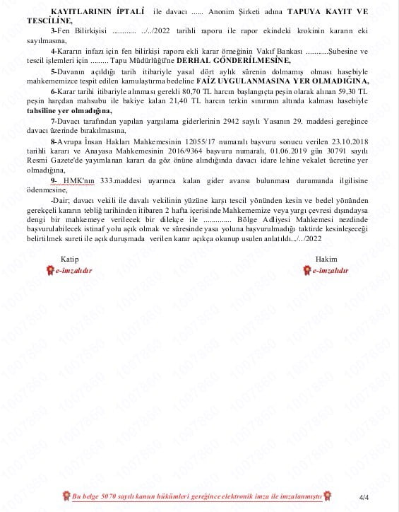Mahkeme tarafından Malik adına açılan Hesaba yatan paranı Malik tarafından çekilmesi Malik aleyhinde bir sonuç doğurmaz. malikin ileride açılacak olan kamulaştırma davasında daha yüksek bir para almasının önüne geçemez aleyhine bir sonuç doğurmaz. Aynı zamanda kamulaştırma davası açılmadan tapunun idareye geçmesini sağlayacak bir sonuçta doğurmaz.