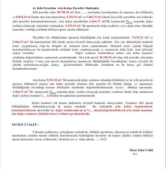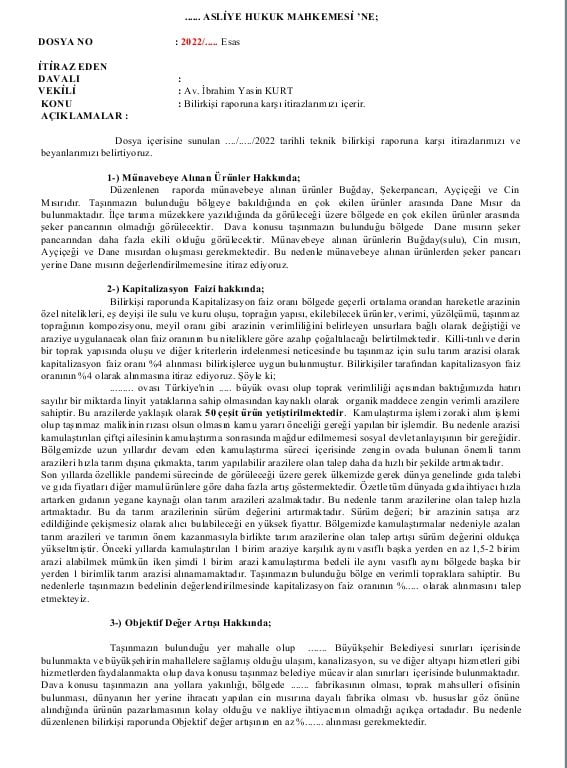 Kamulaştırma Bedelinin Tespitine ilişkin örnek Bilirkişi İtirazı: